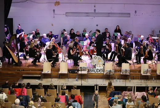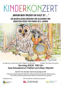Wir sind überwältigt: 520 Besucherinnen und Besucher, mehr als die Hälfte davon Kinder, waren am Sonntag, 8. Dezember, beim großen Kinderkonzert der Bürgerstiftung Rösrath in der Aula des Schulzentrums Freiherr vom Stein in Rösrath. Das Konzert für Kinder von 3 bis 10 Jahren sowie deren Geschwister, Eltern, Großeltern und Begleiter war Teil des Aktionsjahres anlässlich des 20. Bestehens der Bürgerstiftung Rösrath. Gespielt und vorgelesen wurde die Kindergeschichte „Warum mein Bruder ein Kauz ist“ von Alexander und Sebastian Hässy. Dazu spielte das rund 60-köpfige Orchester der Jungen Sinfonie Köln e.V. unter der Leitung von Dirigent Kai Schuster. Sieben Vorleser, darunter der bekannte Musiker Henning Krautmacher (ehemals Sänger der Höhner) und Bürgerstiftungs-Vorstand Stephan Braun, trugen die Kindergeschichte vor. Dabei wurden die Kinder sowohl musikalisch als auch pädagogisch in das Stück eingebunden. Norbert Lenke, Vorsitzender der Bürgerstiftung, begrüßte alle Anwesenden und erwähnte mit stolz, dass dies „ein Tag extra für die Kinder sei, deren Unterstützung ein besonderes Anliegen der Arbeit der Bürgerstiftung Rösrath sei“.